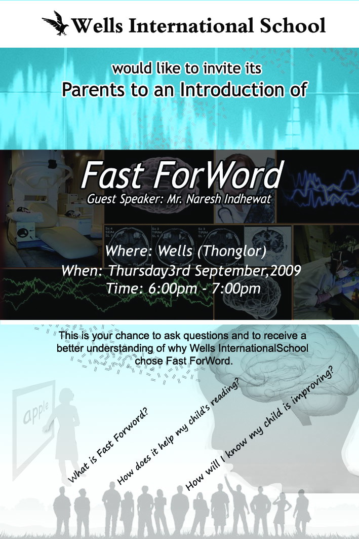 Parents who like to learn more about Fast ForWord and the neuroscientific principles behind it are invited for an interactive workshop on Thursday, September 3, 2009 at 6:00 pm, at Wells International School, Thong Lor campus, situated in Sukhumvit Soi 51. See you there!